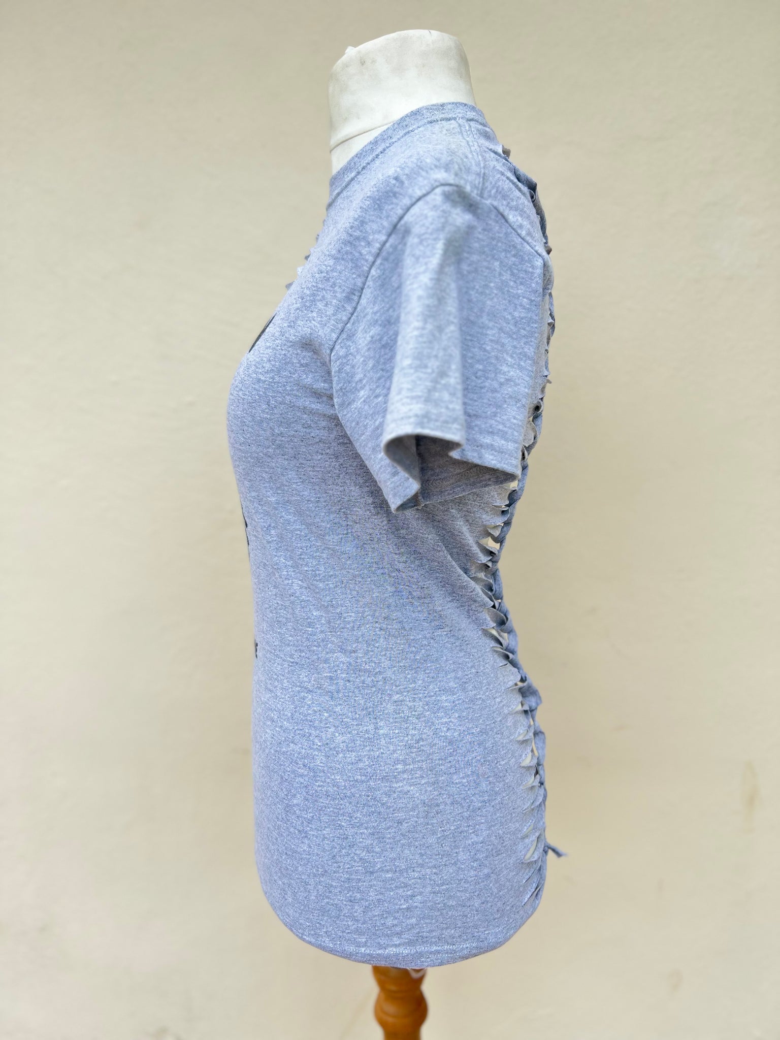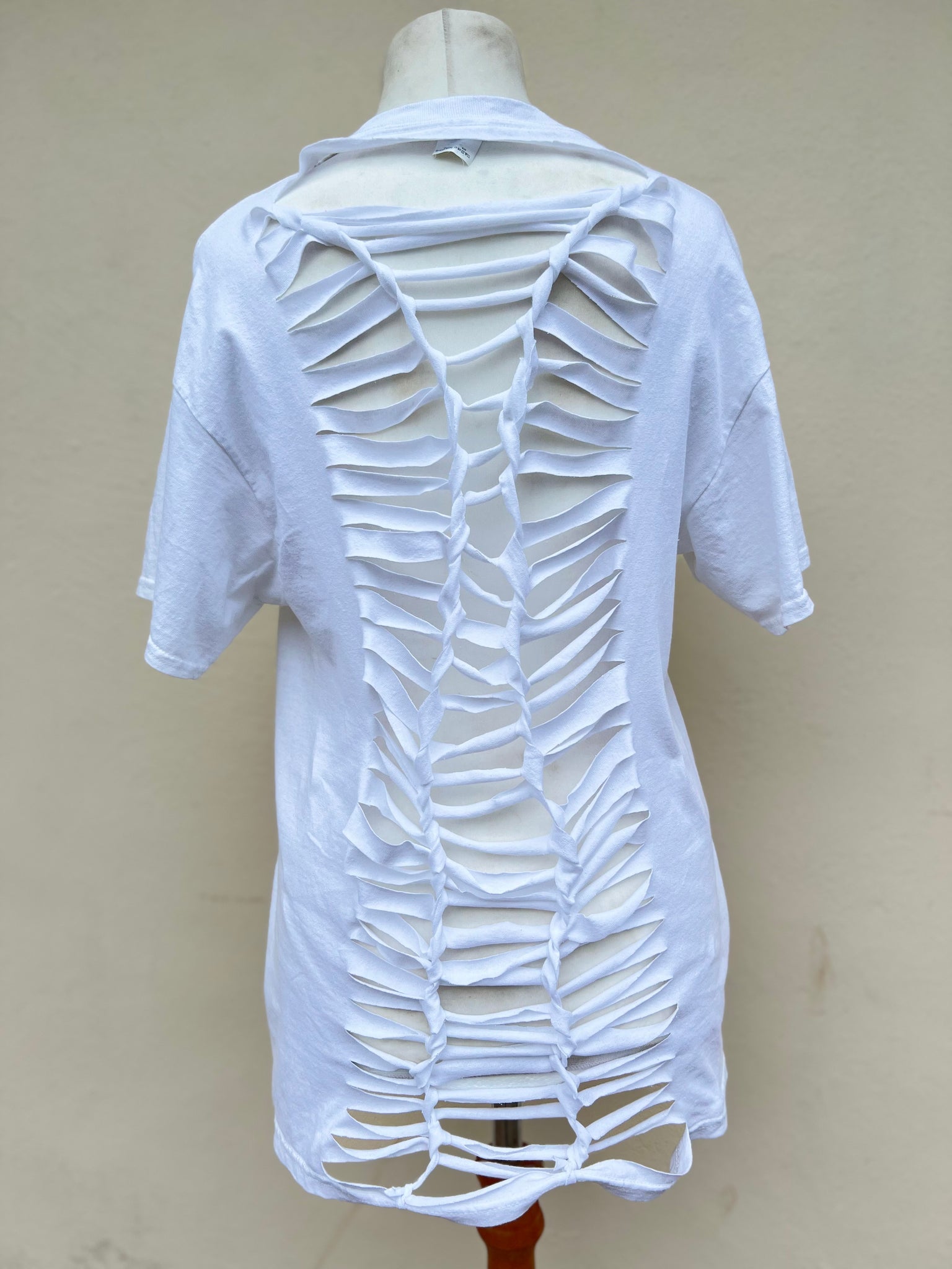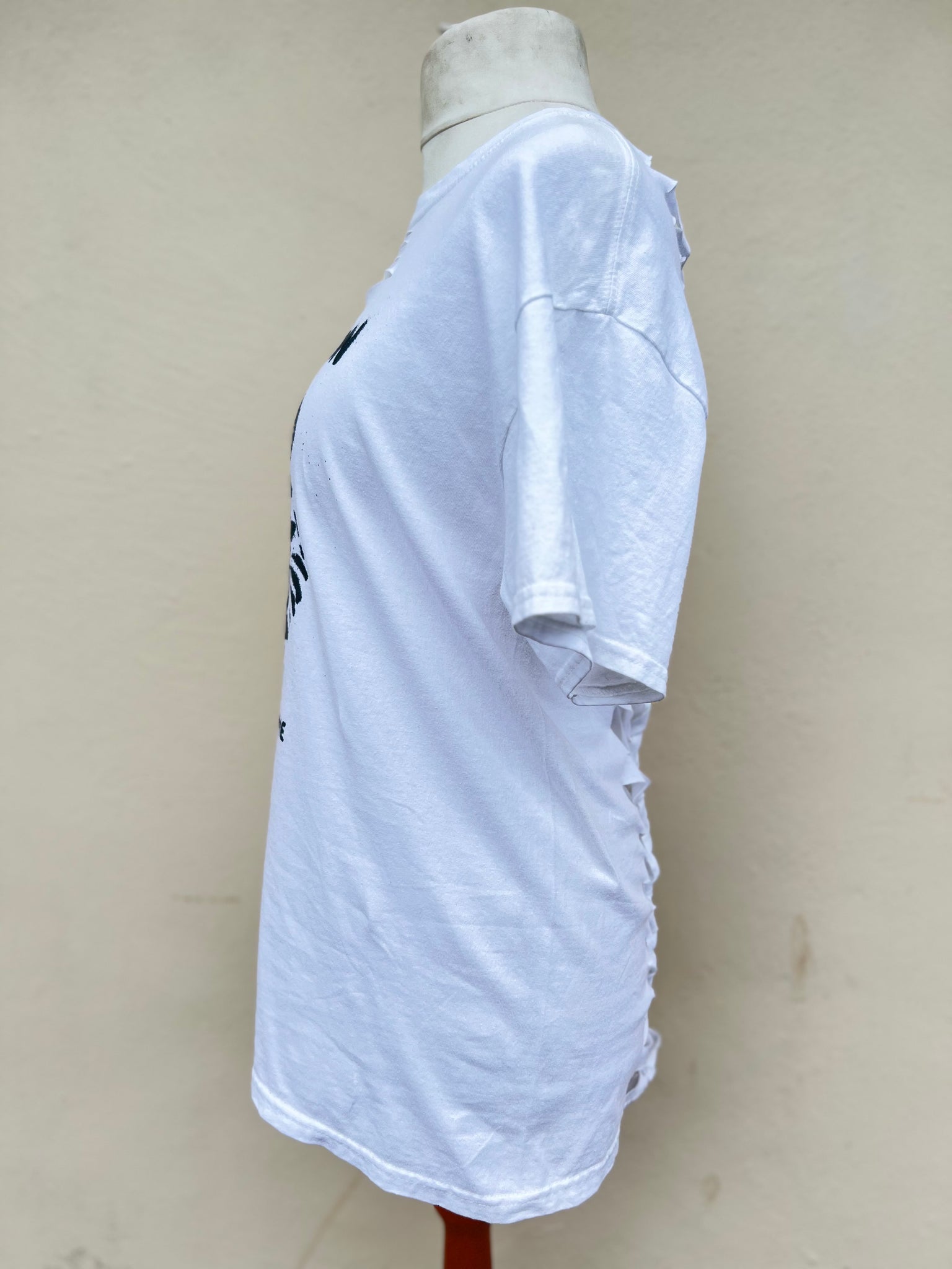 The unique twist on these t-shirts is the "slash design" on the back. This feature consists of intentional cuts or slashes that create a distressed look, adding an edgy, rebellious aesthetic that complements Banksy's anti-establishment messages. The slashes are strategically placed to ensure durability while enhancing the shirt's overall design, making each piece a wearable piece of art.