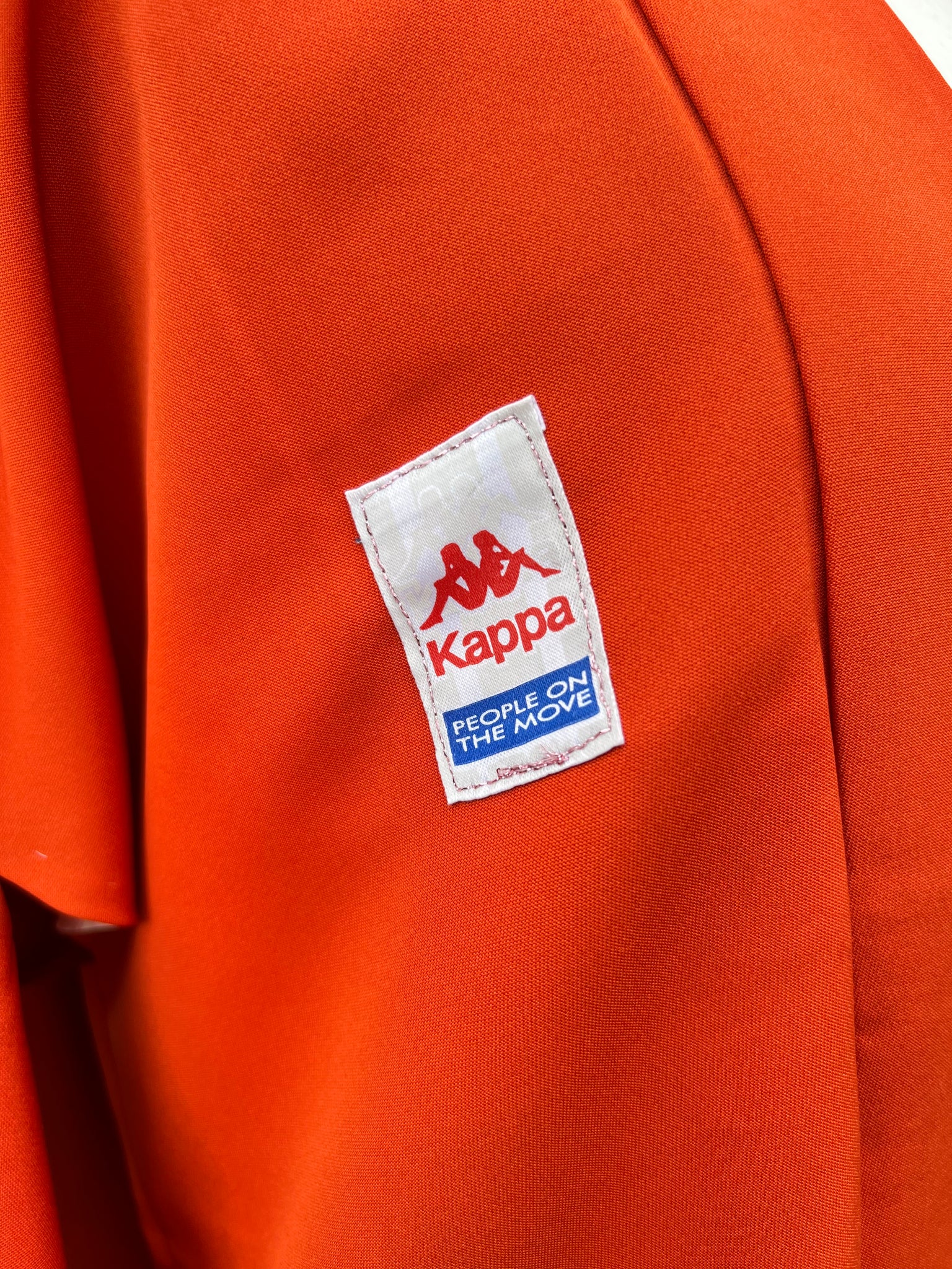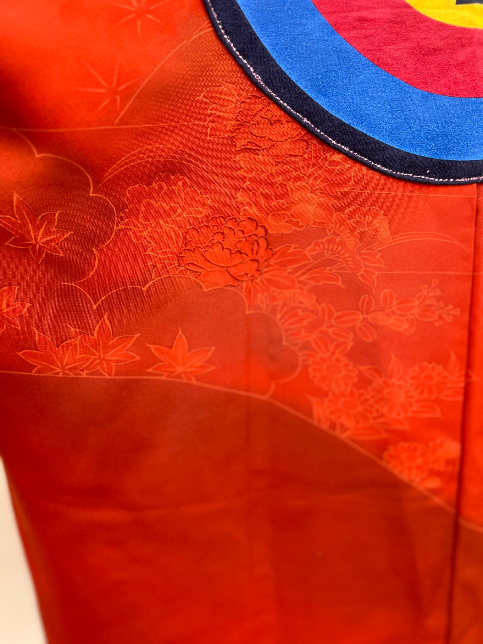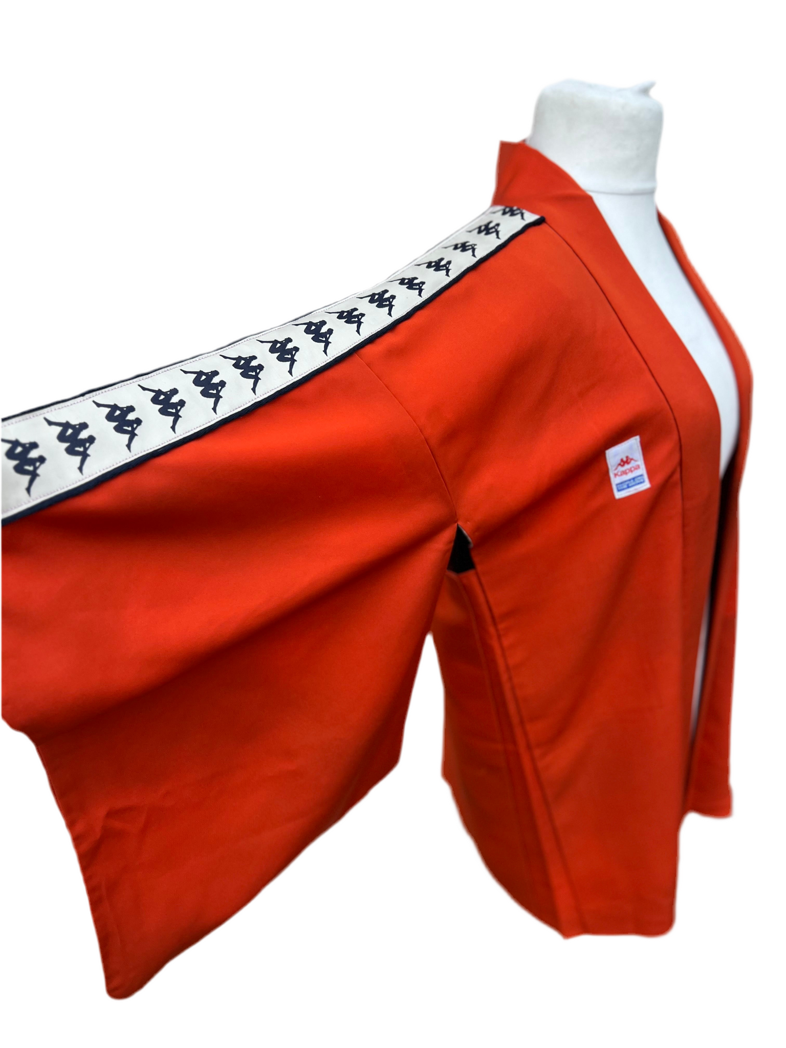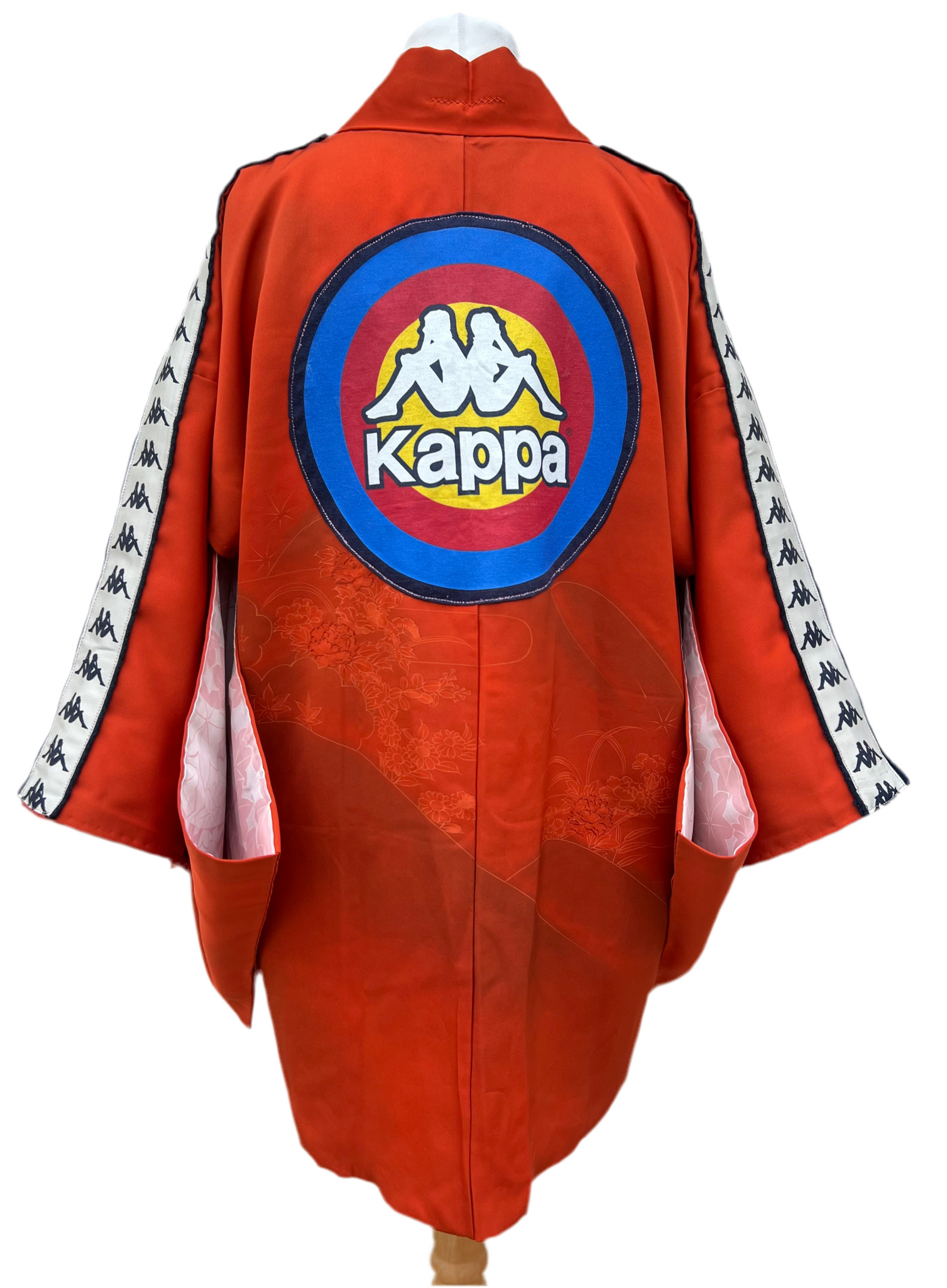This unique Kappa kimono jacket is a stunning blend of Japanese vintage style and modern streetwear. Handmade from upcycled tracksuit trousers and a T-shirt, it’s paired with a luxurious vintage silk haori featuring elegant embroidery of autumn leaves, peonies, and chrysanthemums.