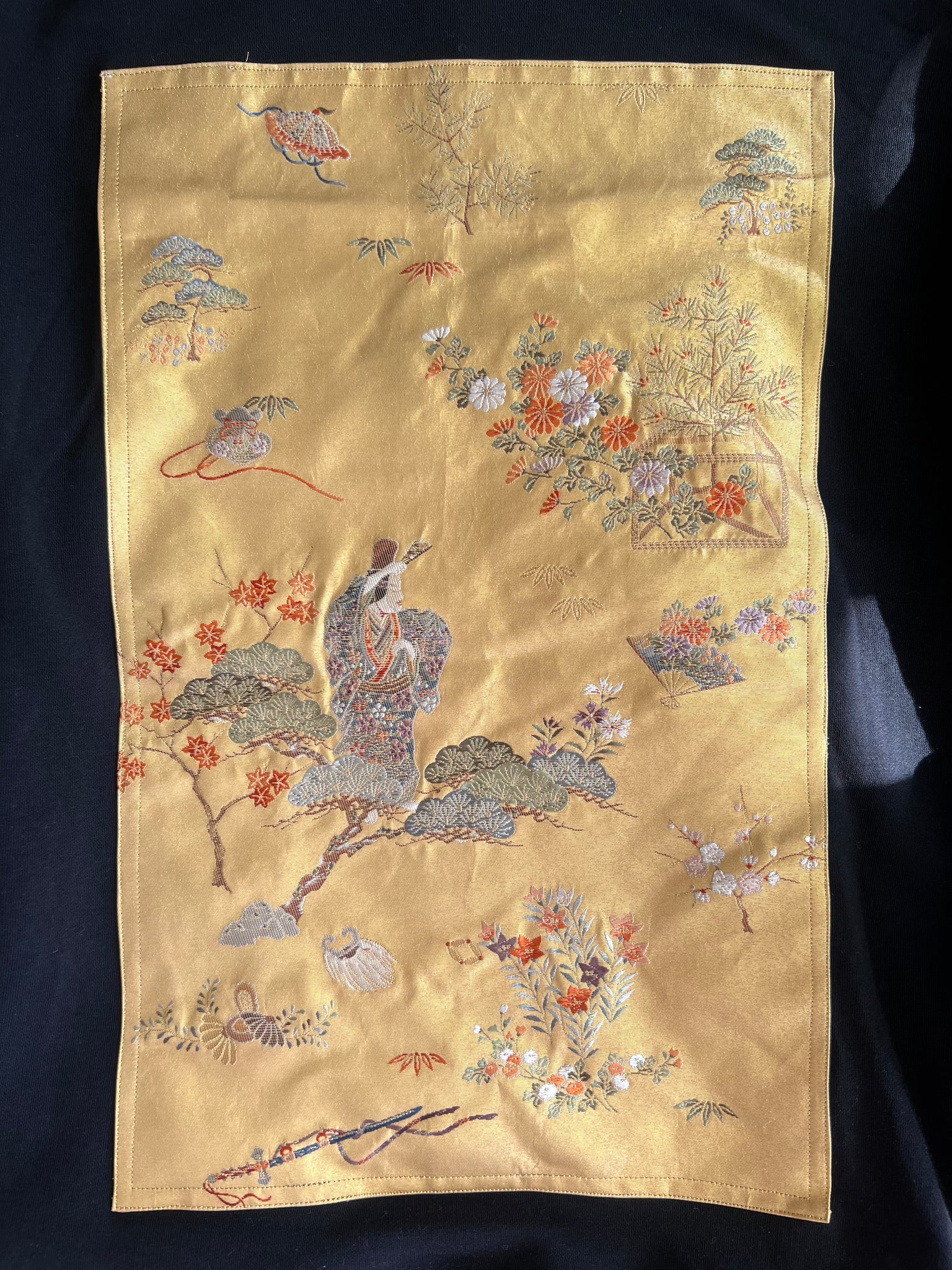 A Fukuro obi (袋帯) is a long, decorative sash traditionally worn with formal kimono in Japan. Usually woven from luxurious silk with intricate patterns, the obi is a symbol of Japanese craftsmanship and culture.