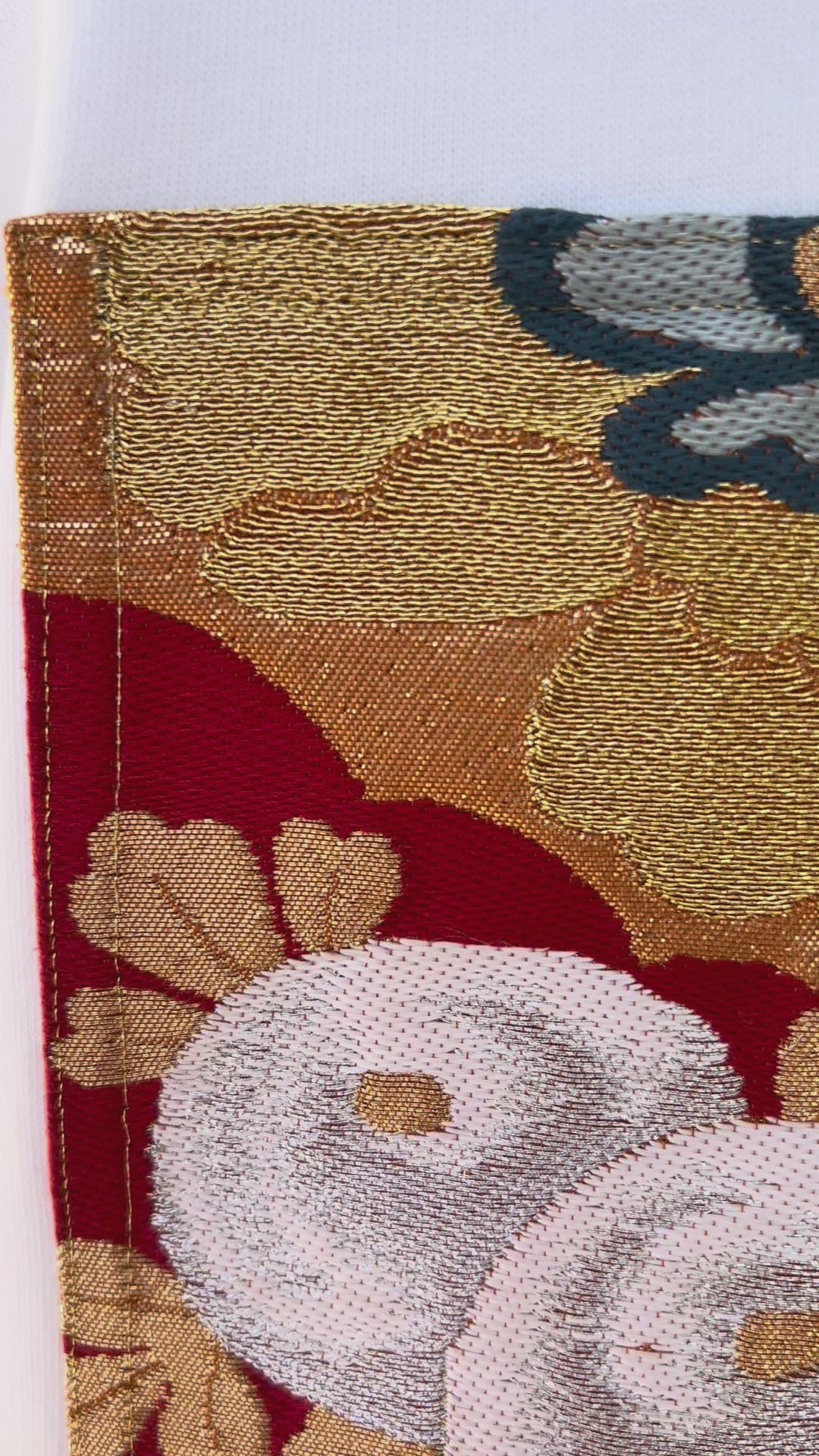 This handmade organic cotton hoodie is uniquely upcycled from a 4.5-metre Fukuro obi, a type of traditional Japanese kimono sash. Each piece is one of a kind, combining modern streetwear with authentic Japanese textile art.