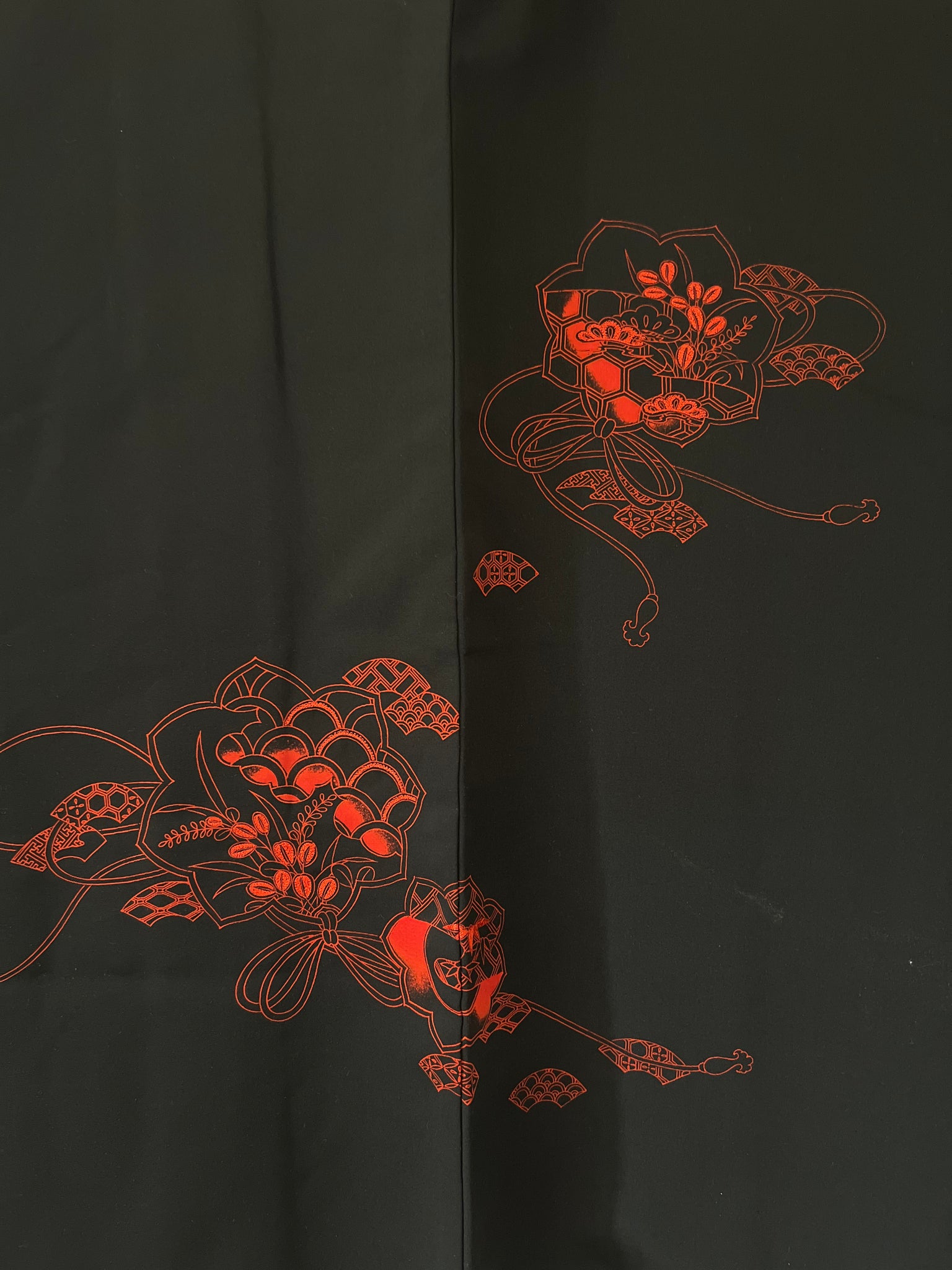 This elegant black silk haori (Japanese kimono jacket) was originally made for special occasions — as shown by the family crest (kamon) on the back, a mark of formality and tradition in Japan.