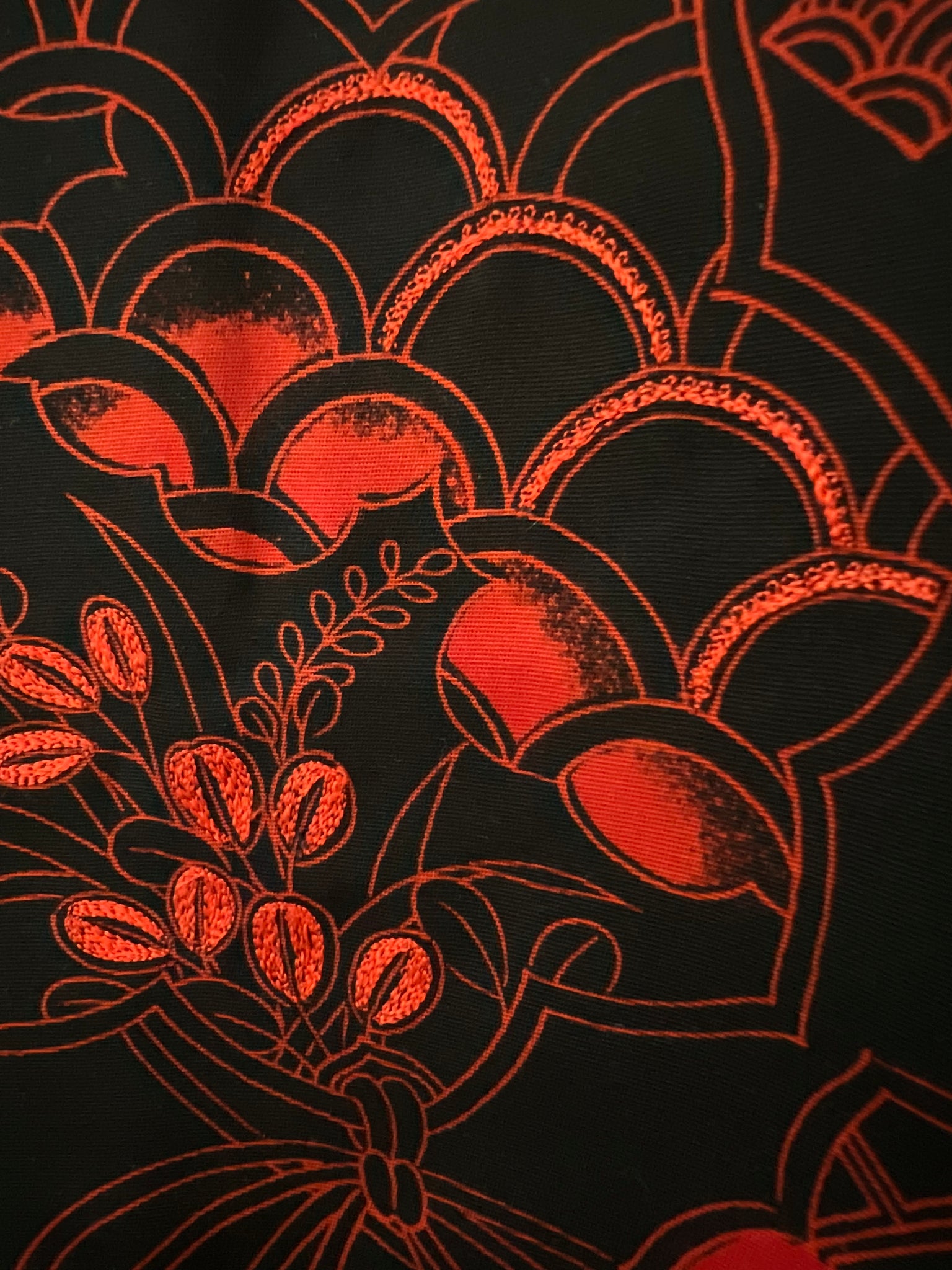The design features a striking red motif of fans and maple leaves. If you look closely, you’ll notice delicate embroidery in the same shade of red, layered subtly over the print for extra depth and texture.